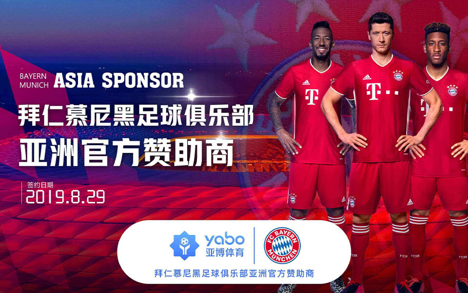 2019年8月29日,拜仁慕尼黑足球俱乐部宣布:自2019/20赛季起亚博体育(YABOSPORTS)正式成为拜仁慕尼黑俱乐部亚洲区赞助商。双方致力于联袂打造一线体育品牌,为球迷朋友们提供全球顶级体育赛事。 亚博体育以其专业的技术团队、精彩的体育赛事和极致的游戏体验而广受业界好评,一跃成为亚洲体育娱乐的领航者。加之人性化的管理理念、中坚卓越的企业文化和专业强大的技术团队,亚博体育在短期内与多家国际著名联赛和球队达成战略合作,其知名度可谓扶摇直上。而与拜仁慕尼黑的合作加快了亚博体育的国际化进程,亚博体育品牌誉满全球。